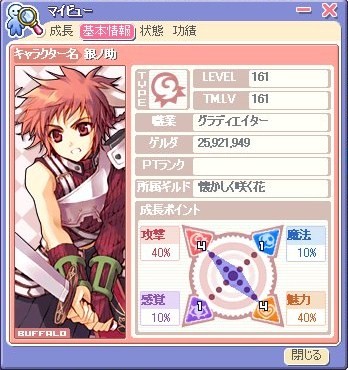 ↓牛ふぁみりぃ 銀ノ助(ぎんのすけ) 230台銀グラ トナカイさん。攻撃+幸運 晃夜(こーや) 180台黒マジェ ぱんだじゃないよ。攻撃極 橙。(だいだい) 190台金グラ めかんうし。攻撃+HP 雹嵐(ひょうらん) 170台青マジェ いんらんらん。幸運極 吟七夜(ぎんしちや) 190台赤マジェ よく特化と間違えられる。HP極 桃守(もも) 140台桃グラ 全身ぺんく。攻撃極 空渡(くうと) 200台青グラ プロカラーこないかなぁ。攻撃極 ~| ̄|廿(うし) 140台銀マジェ もーもー。攻撃+所持 砂陣(さじん)170台金マジェ モフモフ。攻撃+回避 メイン以外F鯖夢島で活動中。 キャラの詳細は「カテゴリ」の「キャラ紹介」からどーぞ^^ カレンダーカウンター最新記事(12/01)