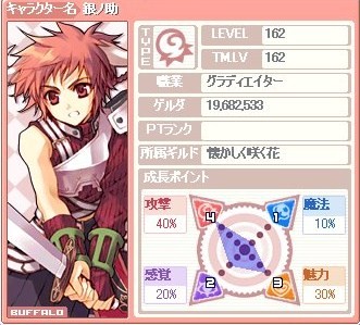 ↓牛ふぁみりぃ 銀ノ助(ぎんのすけ) 230台銀グラ トナカイさん。攻撃+幸運 晃夜(こーや) 180台黒マジェ ぱんだじゃないよ。攻撃極 橙。(だいだい) 190台金グラ めかんうし。攻撃+HP 雹嵐(ひょうらん) 170台青マジェ いんらんらん。幸運極 吟七夜(ぎんしちや) 190台赤マジェ よく特化と間違えられる。HP極 桃守(もも) 140台桃グラ 全身ぺんく。攻撃極 空渡(くうと) 200台青グラ プロカラーこないかなぁ。攻撃極 ~| ̄|廿(うし) 140台銀マジェ もーもー。攻撃+所持 砂陣(さじん)170台金マジェ モフモフ。攻撃+回避 メイン以外F鯖夢島で活動中。 キャラの詳細は「カテゴリ」の「キャラ紹介」からどーぞ^^ カレンダーカウンター最新記事(12/01)