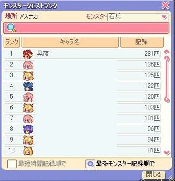 しゅばるつばると牛ふぁみりぃ+αのとりすた放浪記PAGE | 77 78 79 80 81 82 83 84 85 86 87 | ADMIN | WRITE 2007.08.21 Tue 14:48:28 影あるところに光ありトリスタで一番多いのはやはり龍なんだろうか・・・w ちょいと出かけてたので、更新は久しぶりですw トリスタは一応やってましたが・・・ まず、りぜるんが今日二次転します><ノ 詳しくは後ほど・・・w りぜるんの二次試練を待ちながらギルメンさんと埋まるw さてさて、最近サブのこ~やでインすることが多くなってきて、レベルも順調に上がってきています ただ、銀の一次姿に見慣れてしまったせいか、新鮮味がないので(ぁw 服も変えてみることにしましたw 真っ黒ですw 非常に見つけやすいと思われます・・・w 最近切実にペットに悩んでます; ライカンは好きだから手に入れたんですが、そもそも課金ペットに魅力を感じないので サブたちはこのまま青ペンで行くのかな~・・・ ライカンもそこまで強くはないんですよね~; それはさておき 限界に挑戦(ぇw 下のほうにちゃっかりギルメンさん発見w 途中で回復買いに戻ってまでやりました・・・w 制限レベルぎりぎり、かつ、沸き場所でひたすら殴り続けていたので 非課金ではこのくらいが限界かな~とw 本気で頑張れば350くらいはいけるんじゃないでしょうか・・・(だから何?w 夜中にそんなことしていたら・・・ 弟いたんですか・・・! PR 2007.08.14 Tue 14:43:06 トリスタバトン+お知らせ~お知らせ~ 突然ですが、今日の夜に二次転職する(かも)ですw (ぶっちゃけ、あの人とかあの人の予定しだい・・・w はい、それではバトン 10問バトン ~~ルール~~~~~~~~ 回された人は必ずすること。 それだけ! ~~~~~~~~~~~~~ Q1 いま主に使ってるキャラは?職業、Lv、名前を教えて! 銀ノ助ですw 銀さんと呼んでください(何 職業は戦士ですが、もうちょっとでグラディエイターにw Lvは132/121です Q2 外見が好きなキャラは? 牛です!牛しかいませn(ry 二次はみんな好きです・・・w Q3 恋人いる?(TS内で い、いないと思います・・・; Q4 一番好きな場所は? ウブスのF3ですw 理由は人がいないから!(ぇw (でも、これから新クエとかできるらしいからなぁ~・・・ Q5 友録してる人で、一番多いキャラは? ん~・・・狐さんはいなかった・・・気がする・・・・ 他はみんな似たり寄ったりですね・・・w 一次以上の牛さんなら大歓g(ry Q6 友達として好きな人は?(同姓おk ↑同姓の「せい」は「性」ですよw 友達としてって・・・・友達はみんな好きに決まってるじゃないですか! Q7 キャラ何人いる? 3人ですw 牛たぬ牛です あ、ジュエリアにも一応一人います・・・w Q8 掘り好き?それとも狩り好き? 前は狩り好きでしたが、最近掘りにハマってきましたw Q9 好きな種族を並べて!! (ウケを狙うか、真面目に答えるか・・・w 牛>その他! えと、真面目に答えます・・・ 牛>獅子>狸、龍、羊>猫、狐・・・・・ Q10 お疲れ様でした。回す人を3人以上どうぞw 画面の前のあなた、で(ぇw どなたか受け取って><b 以上ですw おまけ これはひどいwwwww 2007.08.13 Mon 11:50:18 満月の夜にご注意をバトン消化したいところですが、ちょっと後回しで(ぁw というのも、昨日(今日の早朝)サブの晃夜が一次転職したからですw ギルメンの獅子さんが、登校路でレベル上げしてたところにお邪魔して、PT組ませてもらいましたw あそこ実はあんまりPTないんですよね^^; 二人ともレベル60になったところで、 転職品のそろっていた俺は一足先に転職させてもらいました^^ (わくわく・・・w なんで牛は攻撃力でうさに見劣りするんでしょうね・・・・?w そして、そんなに便利な範囲攻撃はない・・・・ そんなことはおいといて・・・ きゅい~ん・・・ (ここのエフェクト綺麗だと思うw うおっ、なんか新鮮だ・・・(何w しかし、速攻で髪の色を変える(ぁ 見にくいですが、黒です 名前が「晃夜」なんで黒にするって決めてましたw というわけで、二人目の一次職です 二次はまだまだ先かな~・・・ では、次回こそバトンでw |