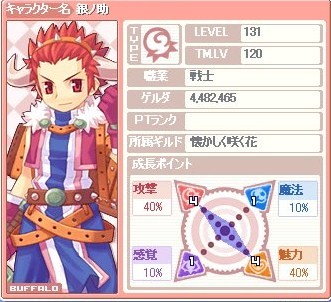 PR 2007.08.10 Fri 13:01:00 足跡を残さずちょっと久しぶりなので、ss溜まってるかな~、と思いきや・・・ 3枚しかありませんでした・・・w しかも、同じ場面・・・・・ (撮ったはずのも撮れてなかったし・・・・>< 先日、ギルメンのうささんが転職しましたーw 右下の猫さんのかぶりものが好きです^^(関係ないw じゃじゃーんw そのあと、アパカの試し撃ち見に行って、そのままフィールドで雑談会w 最近、ちょこっと掘りにハマってきましたw まだ、感知90にはなってないですが、掘れるかどうかはリアルの運ですね^^ カバリアDに行って、べっこう2個掘ってきましたw ついでに、金クエ品も集めたり・・・ って、どっちも俺はいらなかったのでそのままりぜるに~w さらに、風の石が欲しくなったのでカバリアの鉱山クエに挑戦w 上級軟鉄はすでに15個あったので、ひたすら猫眼石を掘る・・・・・ ドリル1本弱で11個掘れたので、まあまあかなw 途中で重量きつくなったのでやめました(ぇw 無事に風の石げとできたので満足です><b (3回やって1個ってのはちょっと泣けるけど・・・w まあ、その風の石はサブ用のLv60装備に合成されましたw と、微妙合成の君ベスを10Mで発見したので、秘薬使ってみようと思い購入w そのうち、サブに持たせます><b 回し車でもいいのですが、せっかくなので赤薔薇を集めようと思います^^ で、赤薔薇が出やすくなってる!? ような気がします・・・・w 単に俺が強くなったから、狩りやすくなったのかな~とも思いましたが、 露天の相場ががくっと落ちてるので気のせいではないようです・・・・ この合成はりぜるが帰ってきたらやってもらいます^^(責任重大w さらに、今度はスワンプDで掘りw ドリル1本半くらい消費しましたが・・・・・ オニバス掘れちゃいました><b 蓮の種も2個げとw あとは、キャラcも何枚か掘れましたw 地味にTMも溜まってきてますw TMあと2レベで二次転できます><ノ 今もう70%まで溜まってるので、もうちょっとです といっても、できるだけ知り合いがインしてるときにしたいので、 しばらく先になるかもです・・・・w 夜中にはサブのこ~やで、葉っぱ鳥狩りw 変な時間にも関わらず、PTがあったのでがっつり稼いできましたw 今朝もまたPT組んで狩ってたら、もう50になりましたーw (一晩で10レベも上げてる・・・・w この子は、銀と違ってシャドウアタックを目指してるので 早々にクイックアクションを習得w 一気にレベル10~ 徐々に楽しみになってきましたw ひとまず休憩で、ワニc集めしないと・・・・ おっと、忘れるところでした・・・ トリックスターラブになりましたねw さっそく、マリンとコーラルで迷子になりかけました・・・・orz 低レベルのペットの能力が修正されてましたね 青ペンが驚異的な能力になってます!w これからもっと高レベルのペットも強化されるかもですね~^^ その辺をちょっぴり期待しつつ、この辺で^^ノシシ 2007.08.06 Mon 13:58:48 世界は裏切らないたまには牛さん以外も描いてみよう、 ということで獅子さん(基本職)描いてみましたw もうちょっと可愛く描きたいのに、どうもかっこいい系になる・・・・;; なんですか、この死に姿の違いは!ww 獅子はやっぱりかわいいです><b まあ、ゴスブルの奥地に腹袋探しに行ったんですけどね・・・・ (腹袋って「原宿」と「池袋」混ぜたみたいだね、というウワサ・・・w ようやく不死草集めが終わりましたーー!><b 特に何もないですが・・・・w そろそろ、本格的に二次転目指して頑張ろうかな~と 現在レベルは128/115です TMが足りないので130での転職はできそうにないですけどね~w 人の少ないドリームの雪の階段でレベル上げw 一人だと若干きついですが、二人でスキルを1発ずつで倒せるので 効率はすごくいいですw 上のssのときは、りぜるがAFKでした・・・・ こんなとこでするなよ、とか思いつつ、頑張って周りの敵倒してましたw 寒そうですよね、ここ・・・ 戦士とか腕丸出しですし、獅子は半袖半ズボンですし・・・・ ライカンは上半身裸ですし・・・・・・(ぇw とと、明日のメンテで大型のアップデートが入りますねーw といっても、マリンとコーラル中心のようなのであんまり関係ないですけどねw どんな風に変わるのか少々見物です ではでは><ノシシシ 2007.08.04 Sat 13:57:47 蒸しパンに虫がたかってるこんにちはw 最近ブログの更新が若干遅めなのは、一日中トリスタつないでるからです(ぁw そして、いろいろやりすぎで覚えてられない・・・・;; ライカン君発見w こっちにもいたんですね~・・・ (俺はただ迷子になってただけ・・・・w この辺の敵もそんなに苦労しないで倒せるんで、ブラブラと歩き回ってます りぜると一緒に雪だるまPTを作ってレベル上げw いや、俺は赤い毛糸集めてただけなんですけどね・・・w 獅子だらけで俺うはうは^^(スルーでw トムベスにも会いに行きました~ レベル的に上回ってるんで、全然問題なく倒せましたw まあ、物理弱点ですしね^^ りぜるも一緒だったんですが・・・・ 一回やられて戻ってくる